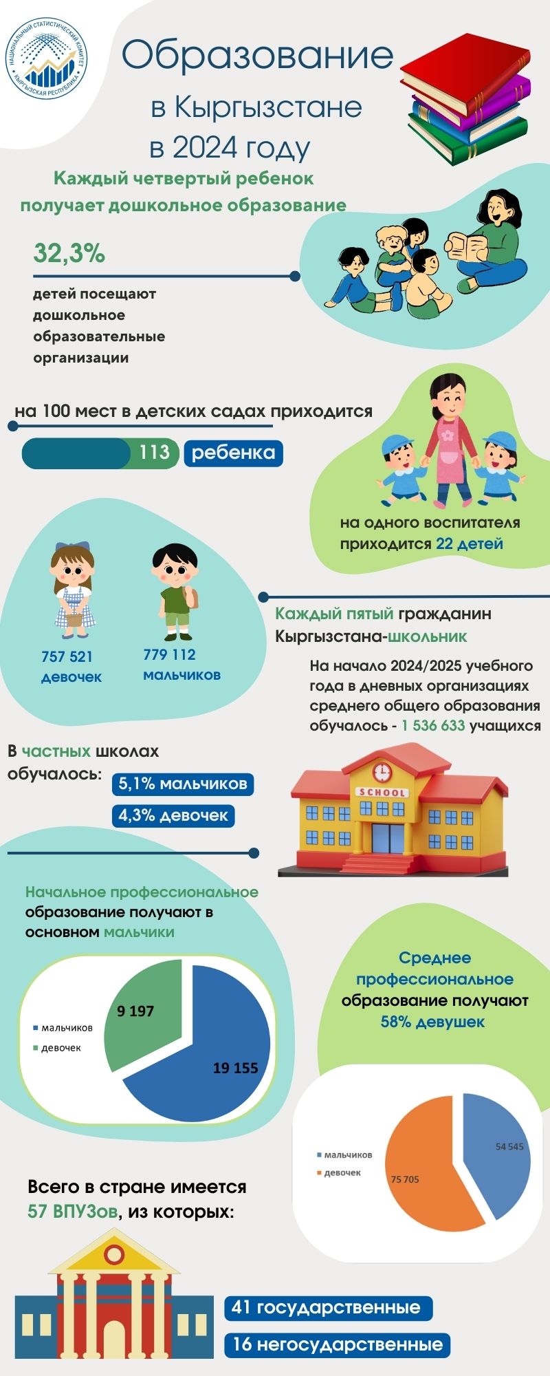 Особое внимание уделяется и дошкольному образованию. Каждый четвертый ребенок в Кыргызстане посещает детский сад — это 32,3 процента детей. При этом на 100 мест в детсадах приходится 113 детей, а на одного воспитателя — 22 ребенка.