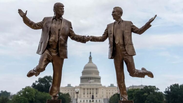 Бронзовая статуя изображает президента Дональда Трампа и осужденного за сексуальную эксплуатацию несовершеннолетних бизнесмена Джеффри Эпштейна. Они держатся за руки, радостно улыбаясь.