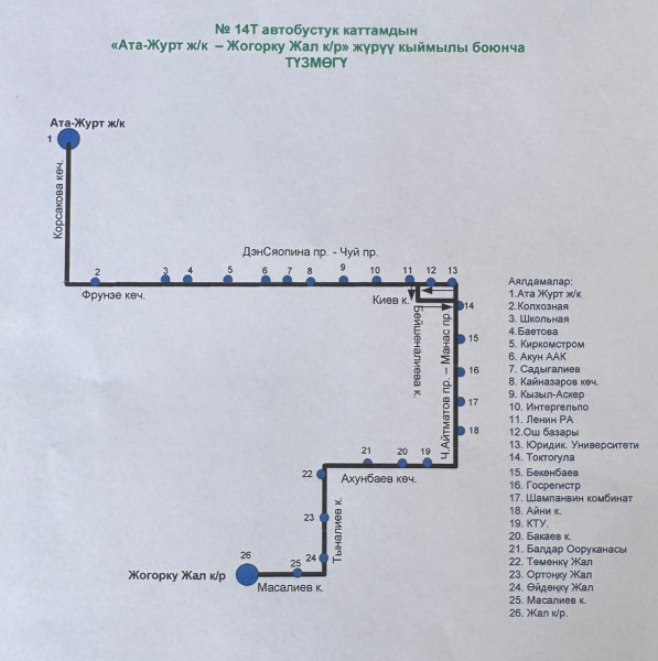 С 1 октября схему движения автобусного маршрута № 14Т временно изменят. Решение принято на основании обращений и просьб горожан. Об этом сообщает пресс-служба мэрии Бишкека.