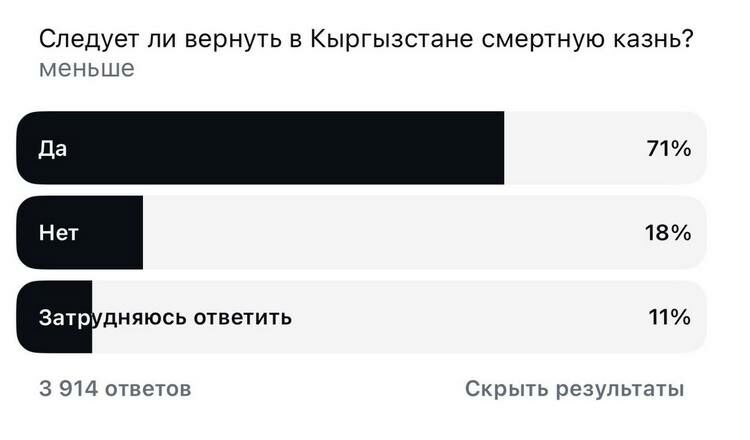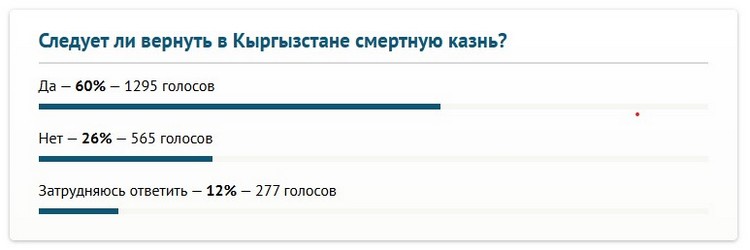 По итогам голосования на сайте 24.kg за возвращение смертной казни выступили 60 процентов респондентов (1 тысяча 295 голосов). Против — 26 процентов (565 голосов). Остальные затруднились ответить (277 голосов).