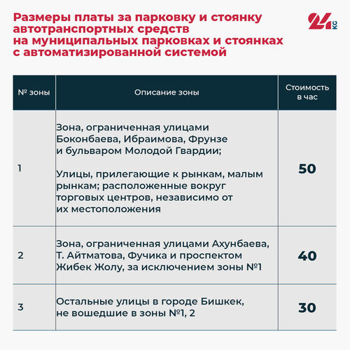 Отметим, мэрия предложила ввести дифференцированную (почасовую) оплату услуг парковочного пространства. В связи с этим в центральной части города планируется установить плату за парковку по зональному типу в размере от 40 до 60 сомов. При внедрении автоматизированной системы будут установлены тарифы от 30 до 50 сомов в час.