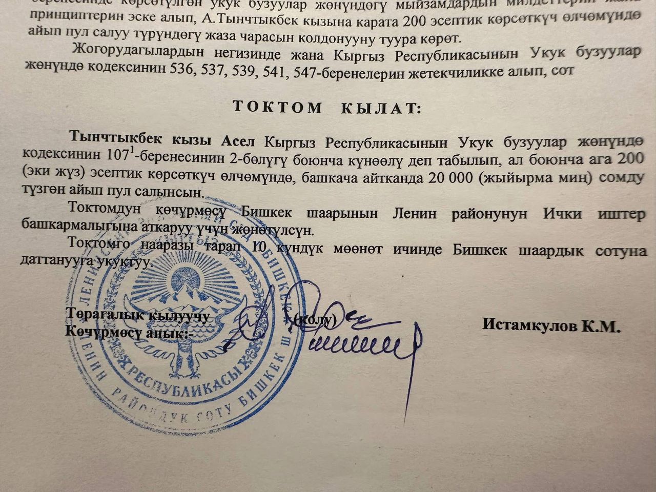 Асель Тынчтыкбек кызы была привлечена к ответственности по статье 1071 «Клевета и оскорбление, содержащиеся в средствах массовой информации, на сайте в сети интернет или на странице сайта в интернете» Кодекса о правонарушениях. Суд оштрафовал ее на 20 тысяч сомов.