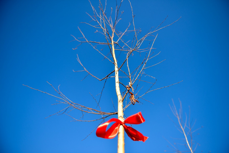 После градоначальник вместе с участниками акции символически завязал ленточки на деревьях, отметив важность бережного отношения к зеленым насаждениям.