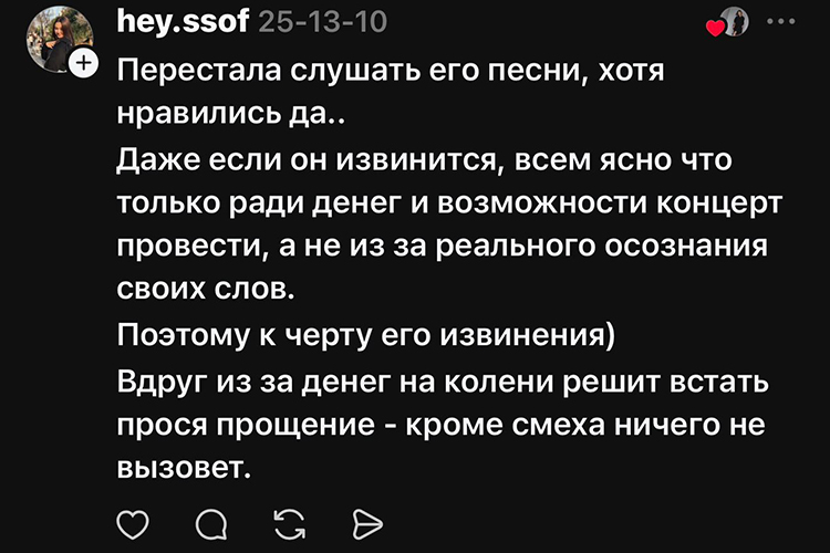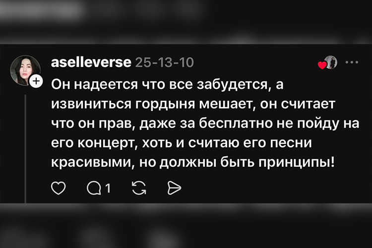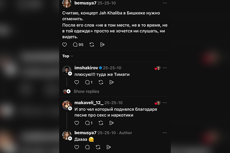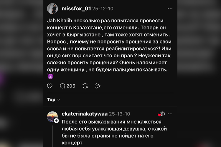 «Jah Khalib несколько раз попытался провести концерт в Казахстане, его отменяли. Теперь он хочет в Кыргызстане, там тоже хотят отменить. Вопрос, почему не попросить прощения за свои слова и не попытаться реабилитироваться? Или он до сих пор считает, что прав?» — пишут пользователи.