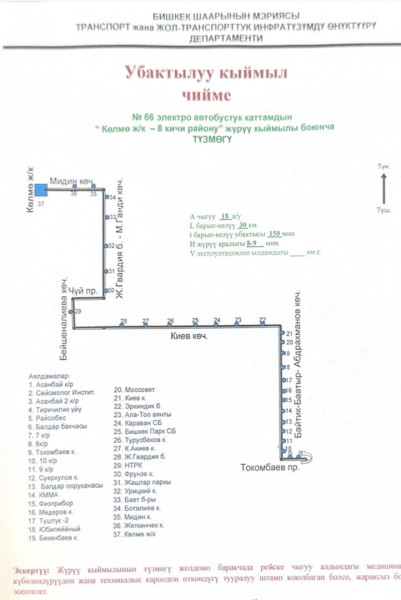 Маршрут: жилмассив «Колмо» — улица Мидин — улица Махатмы Ганди — бульвар Молодой Гвардии — проспект Чуй — улица Бейшеналиева — улица Киевская — проспект Байтика Баатыра — проспект Токомбаева. Конечная остановка — 8-й микрорайон.