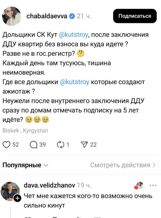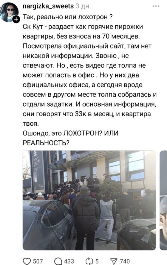 Согласно рекламе, покупателям предлагают квартиры под самоотделку от $900 за квадратный метр со сдачей в эксплуатацию через 3,5 года. По расчетам, за однокомнатную квартиру площадью 29 квадратных метров выходит по 32 тысячи 260 сомов в месяц, за двухкомнатную площадью 50 квадратов по 55,6 тысячи сомов.Пользователи социальных сетей поделились сомнениями насчет данной акции.