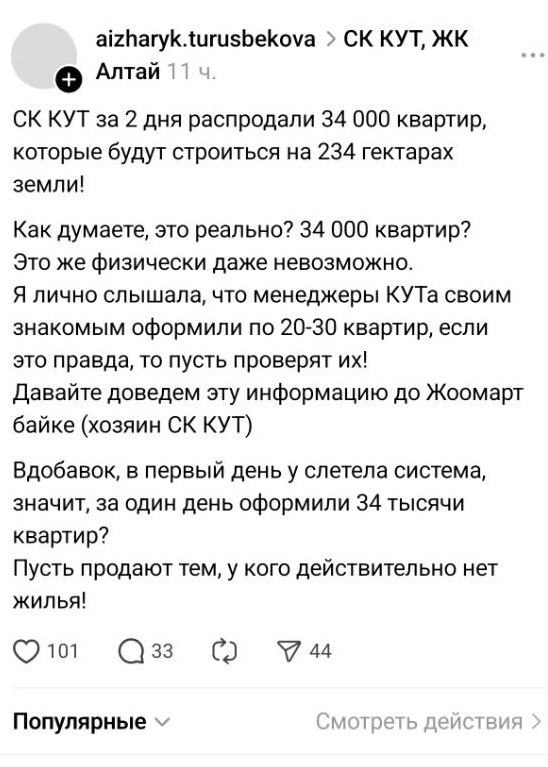 Основатель компании по продаже недвижимости OSK и блогер Бактияр Касымалиев отметил, что в данном вопросе необходимо учитывать расчеты компании и условия, при которых будут строить.