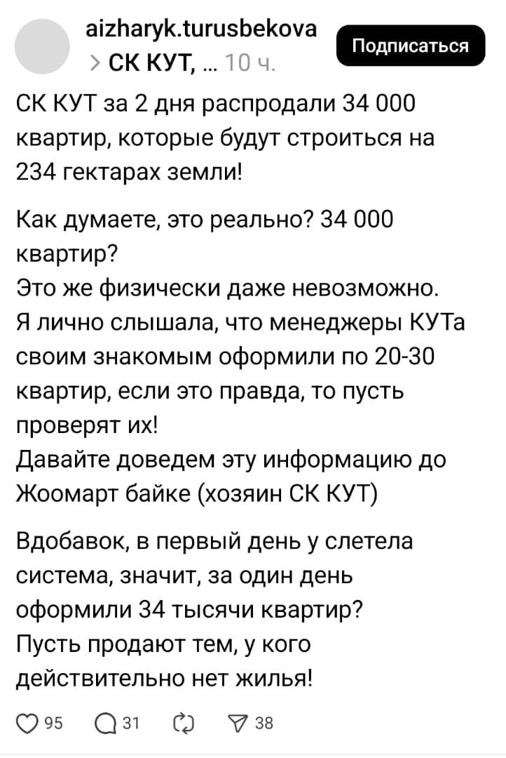 «Вход очень легкий. Записаться легко, но это не означает, что квартиру реально купили. На данный момент у покупателей минимальные риски. Однако, через пять лет они могут вырасти, потому что все деньги, которые человек откладывал и копил с надеждой, что у него будет квартира, могут встать», — сказал Бактияр Касымалиев.