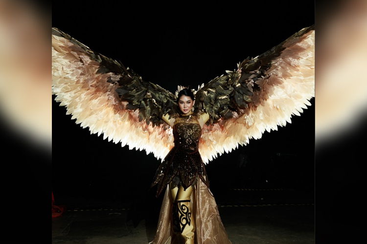 На сцене Мэри Кувакова предстала в величественном наряде, выполненном в золотых и бронзовых тонах, с огромными крыльями, инкрустированными перьями и декоративными элементами. Образ подчеркивал силу и благородство хищной птицы, которая символизирует свободу, смелость и национальный дух кыргызского народа.