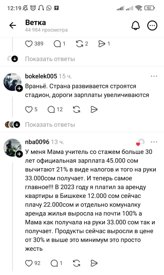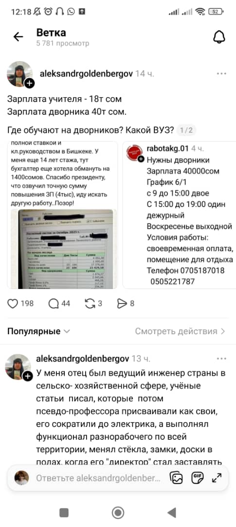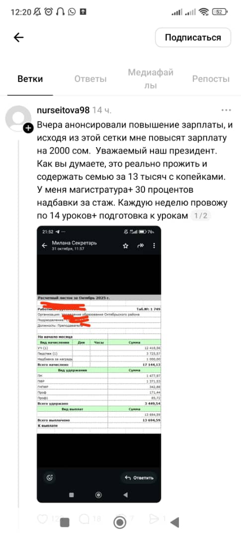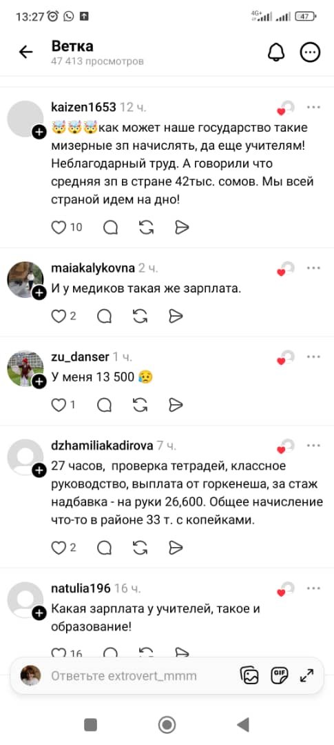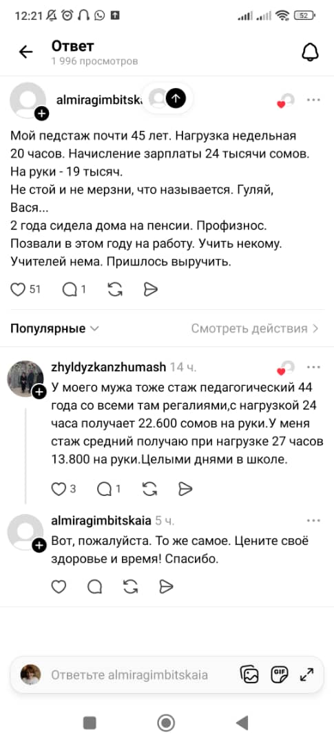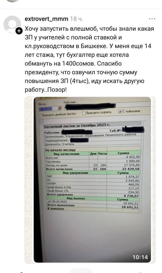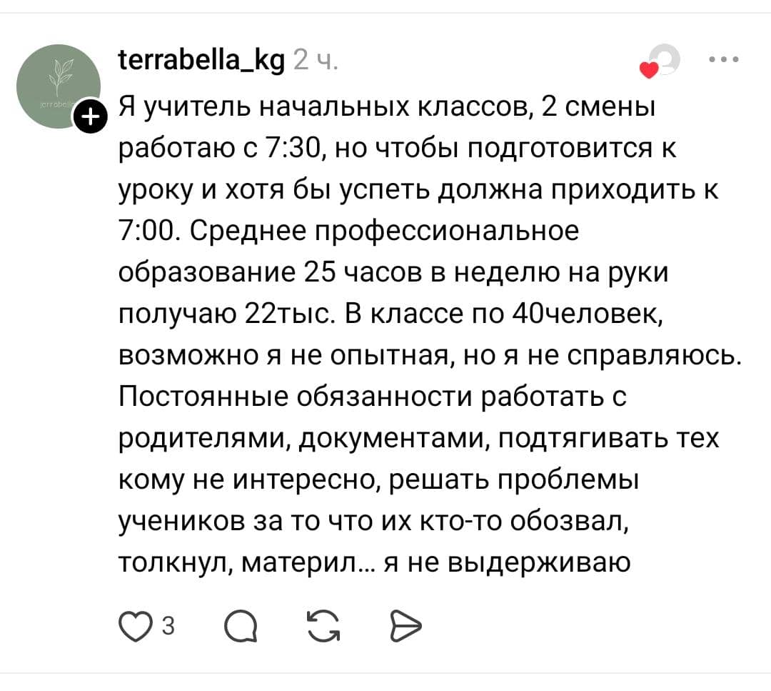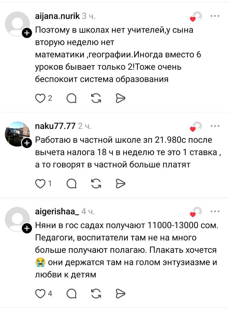 «У моего мужа тоже стаж педагогический 44 года со всеми регалиями, с 24-часовой нагрузкой получает на руки 22,6 тысячи сомов. У меня стаж средний, получаю при нагрузке 27 часов 13,8 тысячи сомов», — говорится в следующем сообщении.