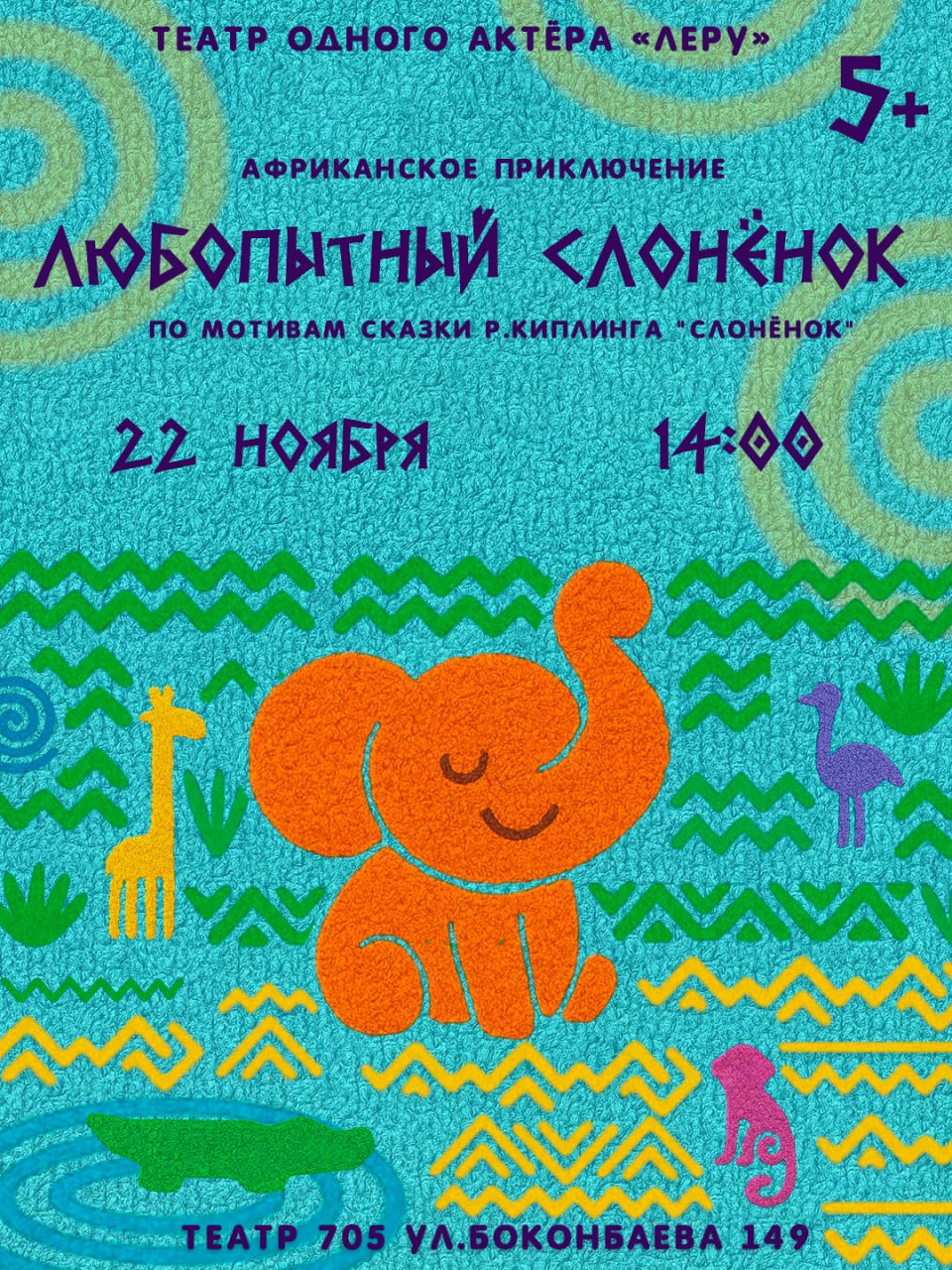 Куклы, созданные в технике «оригами из полотенца» (специально адаптированной для сцены), оживают на глазах зрителей, превращаясь в африканских животных. Все роли воплотит и озвучит одна актриса.