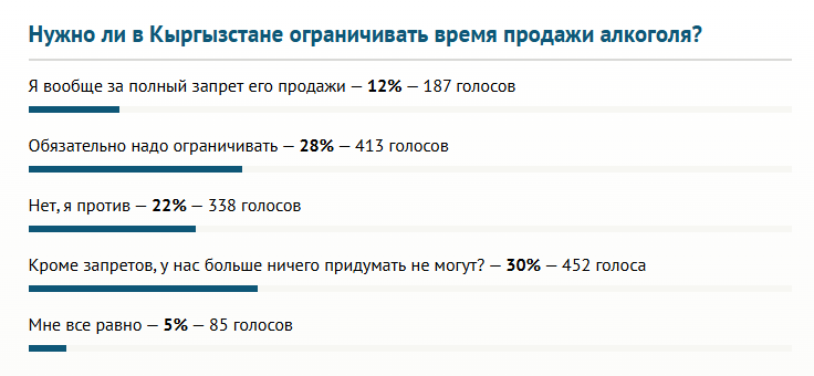 За обязательное ограничение времени продажи алкоголя высказалось 28 процентов читателей 24.kg, принявших участие в опросе редакции. Об этом говорят итоги голосования.