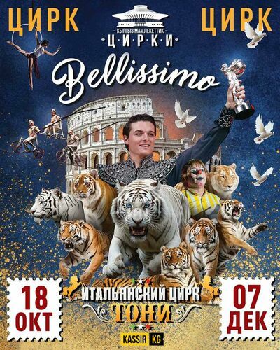 Из самого «сердца» Европы впервые в Кыргызстане выступит итальянский дуэт Флавио и Бруно Тони. Вас ждут уникальные розовые и белые тигры, воздушное импасато, смелые канатоходцы, полет акробатов под куполом цирка, жонглеры, ярчайшие попугаи и клоун из Латинской Америки.