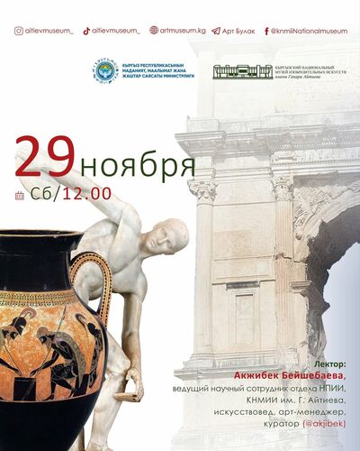 В этот день мы отправимся в увлекательное путешествие в мир искусства Древней Греции и Древнего Рима. Лектор: искусствовед, арт-менеджер Акжибек Бейшебаева.