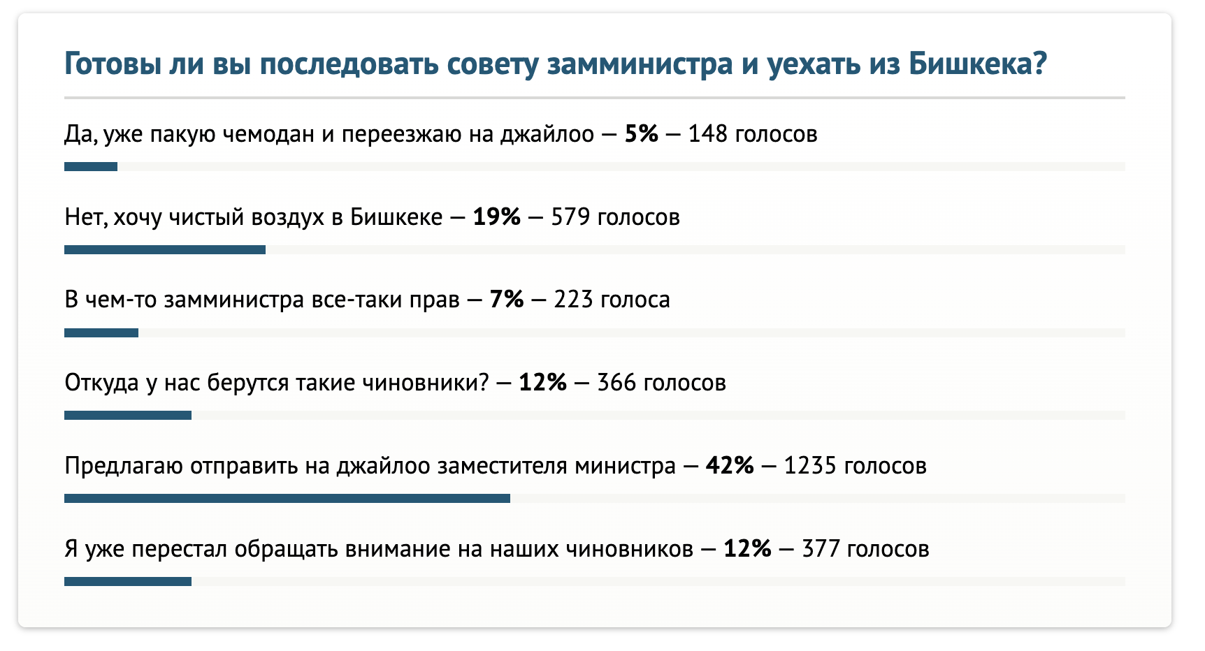 По итогам опроса, 577 горожан (19 процентов) ответили, что не хотят уезжать и требуют чистого воздуха в Бишкеке. Кроме того, 147 человек добавили, что «уже пакуют чемоданы».
