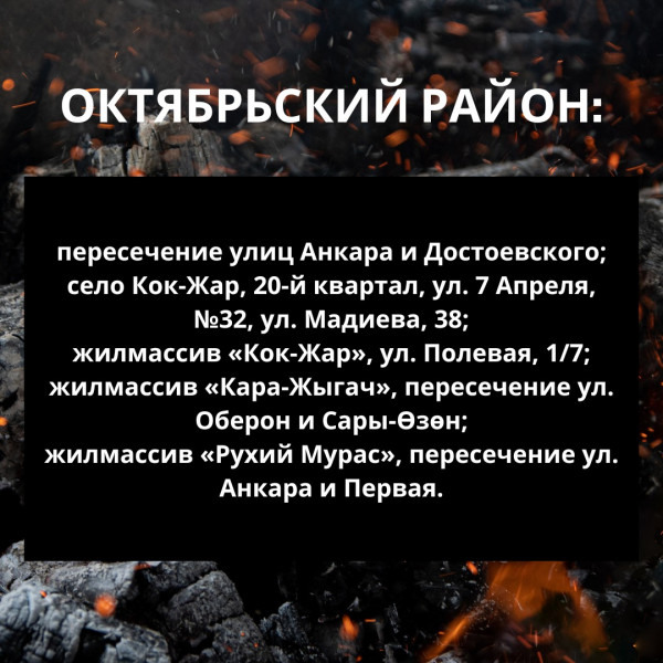 - жилмассив «Кара-Жыгач», пересечение улиц Оберон и Сары-Өзөн;