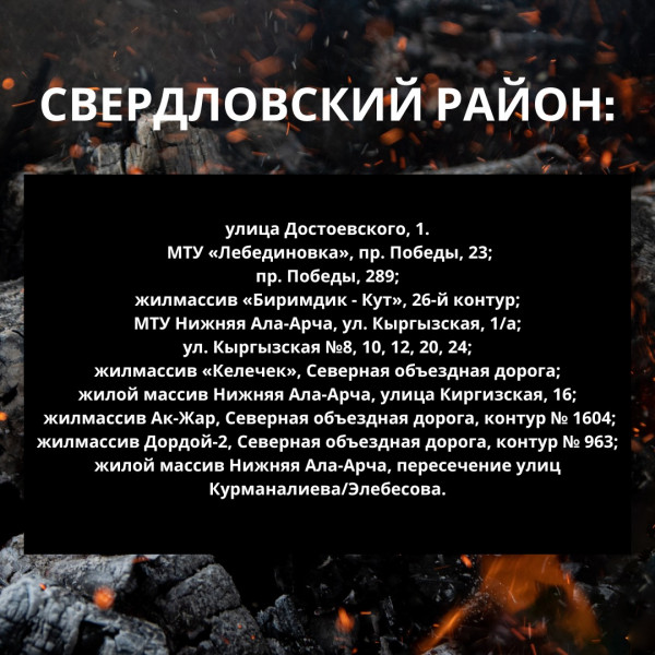 - жилмассив «Нижняя Ала-Арча», пересечение улиц Курманалиева и Элебесова.