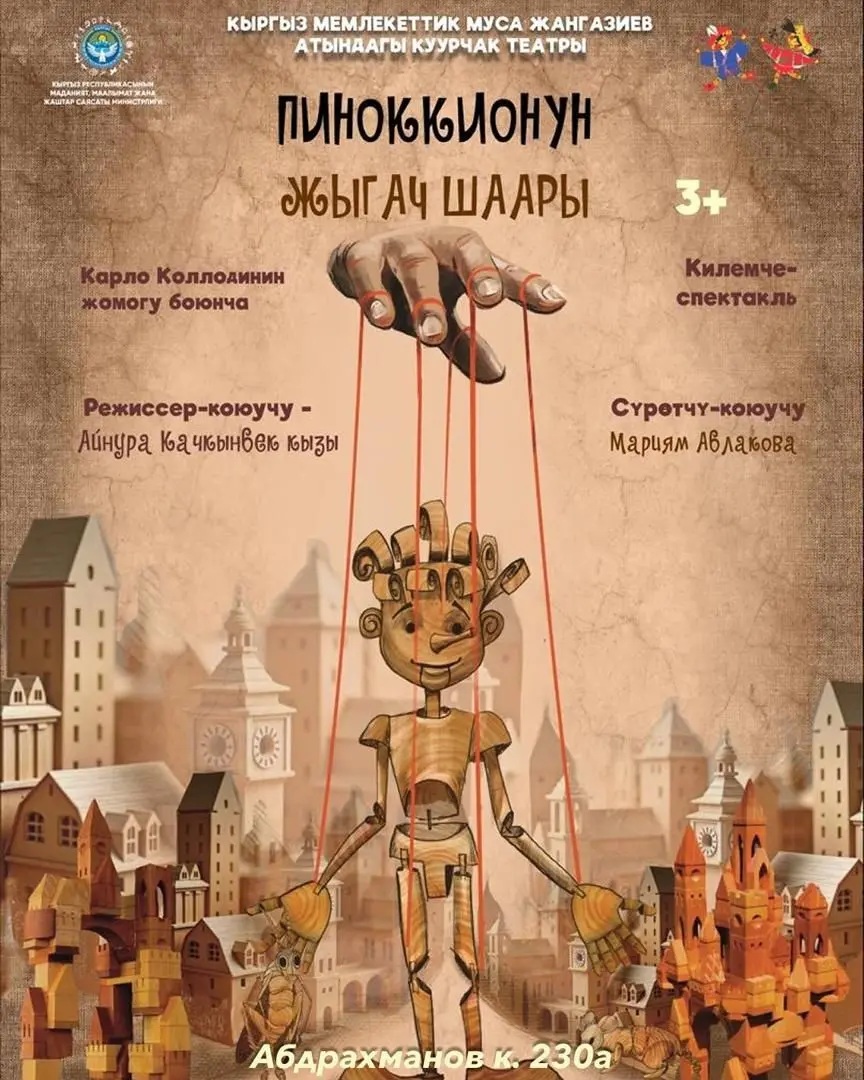 Кыргызский государственный театр кукол имени М. Жангазиева также представляет 31 января по мотивам сказки Карло Коллоди спектакль «Приключения деревянного мальчика».Это интерактивная постановка, в которой вместе с главным героем Пиноккио дети строят город из деревянных игрушек. В этом спектакле зрители становятся его непосредственными участниками. Каждый новый город, созданный во время игры, получается уникальным и увлекательным, как и сами приключения Пиноккио.