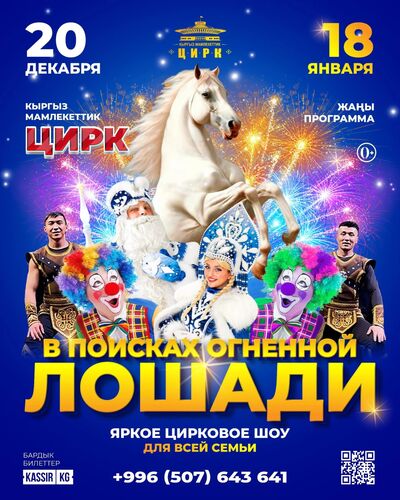 Новый 2026 год Лошади можно начать с похода в цирк. С 20 декабря по 18 января артисты Кыргызского Государственного цирка вновь блистают в новогодней программе «В поисках Огненной лошади».Зрителям представят знаменитую на весь мир грандиозную программу «Кыргызская джигитовка». А также выступят лучшие акробаты на подкидных досках, воздушные гимнасты на полотнах и ремнях, бесстрашные канатоходцы, самые лучшие жонглеры. А необыкновенные эксцентрики вместе с Дедом Морозом и Снегурочкой отправляются в поиски Огненной лошади.