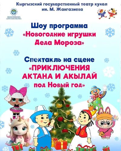 Кыргызский государственный театр кукол имени М. Жангазиева представляет 3 января шоу-программу «Новогодние игрушки Деда Мороза».Новый год — это самый волшебный, веселый праздник, которого дети ждут, веря в сказку и чудо... Дед Мороз изготавливает новые игрушки для праздника, но одна игрушка теряется. Снегурочка, кукла Лол, Единорожка и клоун отправляются на поиски Лабубу. Зрители погружаются в мир чудес, волшебства, невероятных превращений, множества игр и развлечений.
