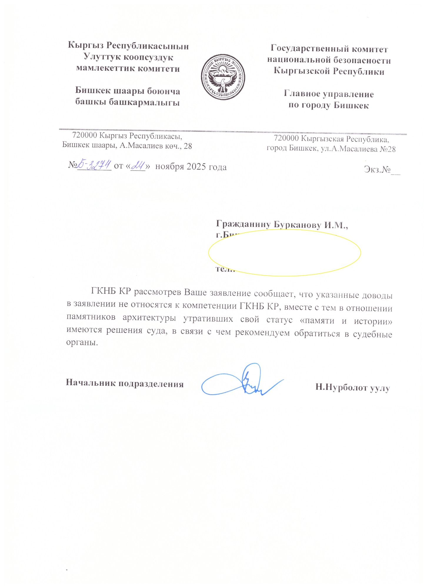 Искандер Бурканов предоставил копию ответа из прокуратуры, подтверждающую законность текущих действий владельца с точки зрения градостроительных норм. Кроме того, по этому поводу он также обращался в ГКНБ, где также ответили, что есть решение суда и они ничем помочь не могут.