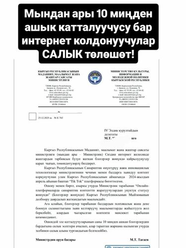В Кыргызстане блогеров, имеющих более 10 тысяч подписчиков и получающих доход от рекламы, могут обязать платить налоги. Об этом сообщил в соцсетях журналист Эламан Карымшаков, ссылаясь на письмо-ответ замминистра культуры, информации, спорта и молодежной политики Марата Тагаева одному из делегатов курултая. Он прикрепил скриншот письма.