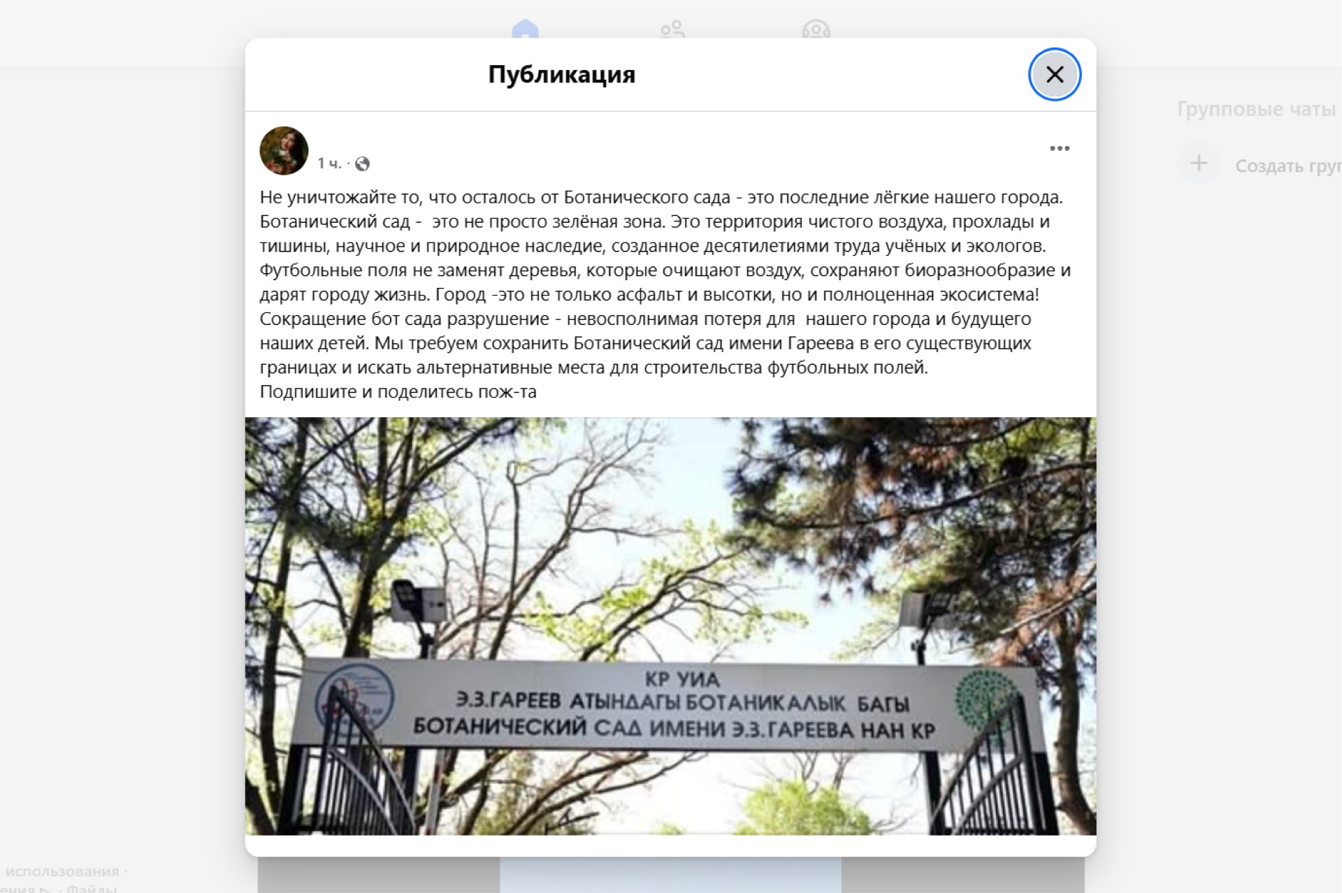 В соцсетях жители Бишкека призывают подписать петицию против застройки Ботанического сада имени Энвера Гареева. Гражданские активисты выступают против размещения футбольных полей на территории «легких» города.