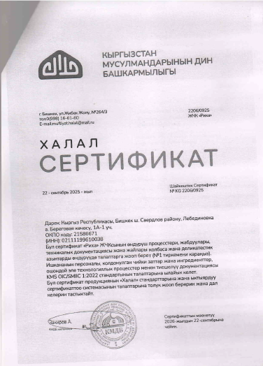- У компании действуют сертификаты «Халал», выданные уполномоченными структурами Кыргызстана и Казахстана, включая Центр развития халал-индустрии, Духовное управление мусульман КР и Halal Damu.