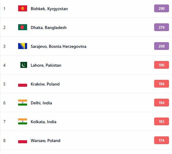 В рейтинге крупнейших городов мира по качеству воздуха World Air Quality на 21.00 Бишкек находится на первом месте.