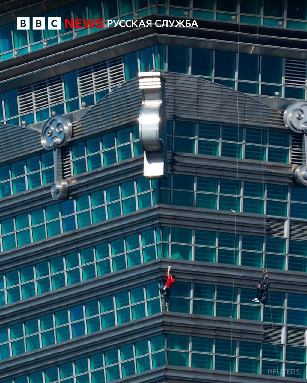 Альпинист Алекс Хоннолд поднялся на 101-этажный небоскреб на Тайване без веревки и страховки, пишет BBC News.