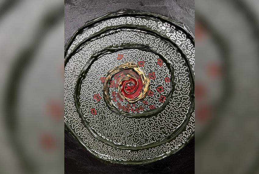 — Да, это одна из самых трудных моих работ. Я порезал холст в трех местах с мыслью о том, что предательство — это как сломанные руки: простить можно, но обнять уже невозможно. Три открытые раны в центре темной материи — это визуализация того, как травма разрушает базовую архитектуру доверия. Целостность уничтожена. Даже если сшить края, шрам останется навсегда, меняя геометрию близости. Я не хотел резать холст, но трижды возвращался к этому импульсу.