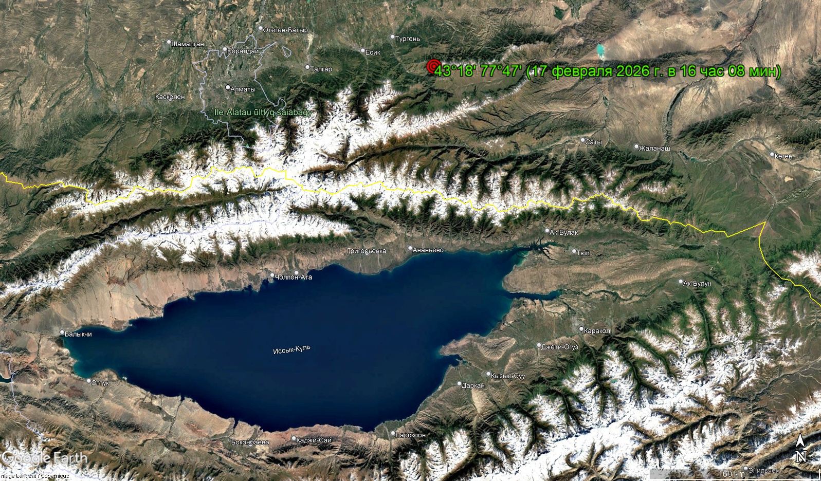 17 февраля в 16.08 Институт сейсмологии НАН КР зарегистрировал землетрясение силой в эпицентре около 5 баллов по 12-балльной шкале MSK-64 (магнитудой Mpv=5.1).