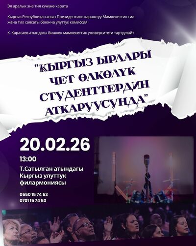 Отмечается, что в Кыргызской национальной филармонии имени Т.Сатылганова в сотрудничестве с Бишкекским государственным университетом имени К.Карасаева 20 февраля пройдет республиканский фестиваль под названием «Кыргызские песни в исполнении иностранных студентов».