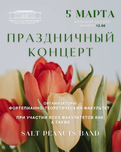 При участии всех факультетов консерватории, а также специального гостя — Salt Peanuts Band. В программе — разнообразные музыкальные номера, живое звучание, творческая атмосфера и праздничное настроение.