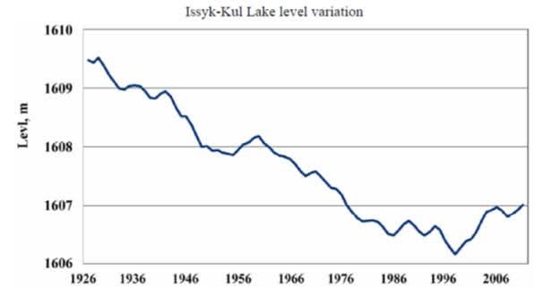 По его словам, на рисунке показан график падения уровня озера Иссык-Куль с 1926 года, когда начали регулярные измерения.