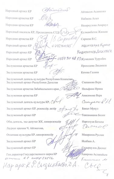 Под обращением поставили подписи десятки представителей культуры — народные и заслуженные артисты Кыргызстана, режиссеры, писатели, общественные деятели и кинематографисты.