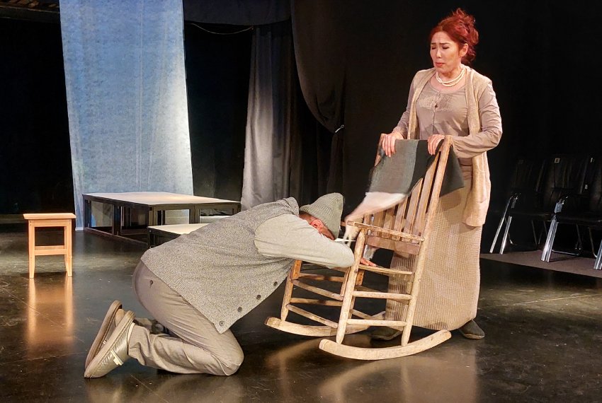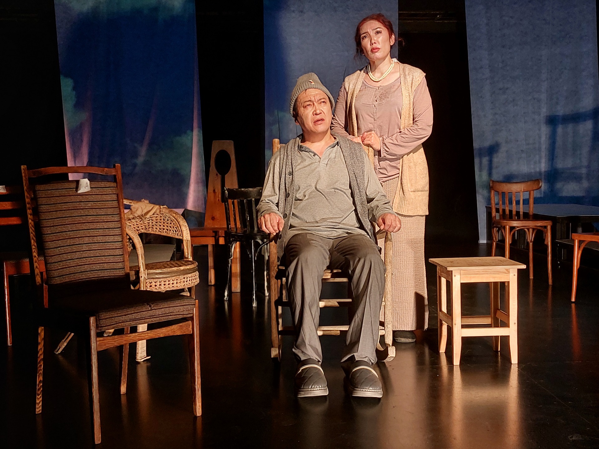 Постепенно сцена заполняется стульями, а вместе с ними — воспоминаниями, фантазиями и попытками героев понять смысл прожитой жизни.