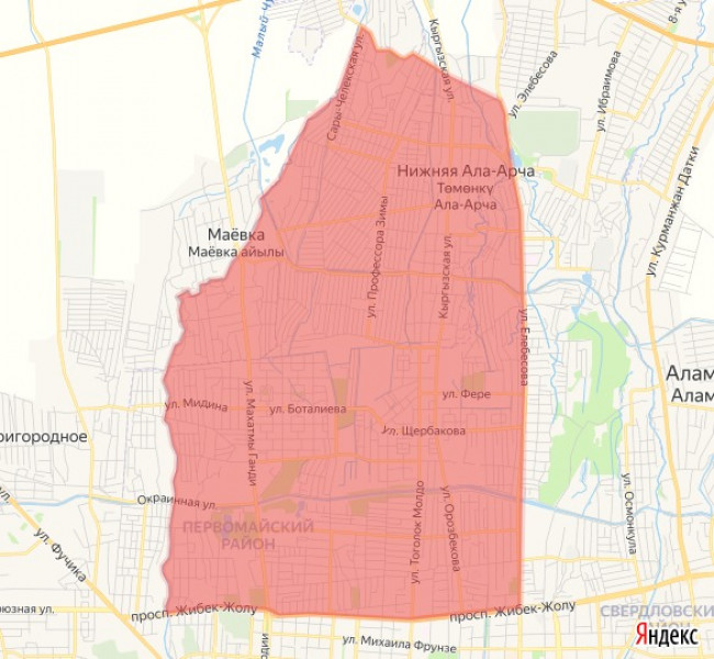 Район отключения, ограниченный улицами: Куренкеева, Абдрахманова, Элебесова, Бельской, рекой Ала Арча, проспектом Жибек Жолу, бульваром Молодой Гвардии, БЧК, улицей Саадаева.