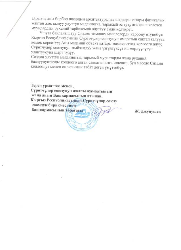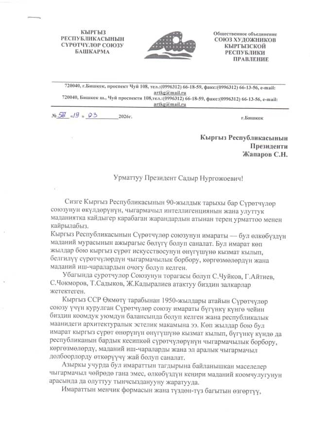 Союз художников Кыргызстана обратился к президенту Садыру Жапарову с просьбой сохранить здание организации в Бишкеке, которое, по их словам, является важной частью культурного наследия страны.