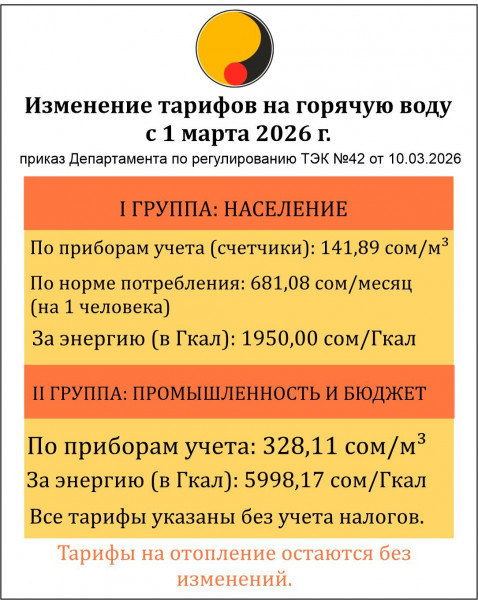 Муниципальное предприятие «Бишкектеплосеть» сообщает об изменении тарифа на горячее водоснабжение.