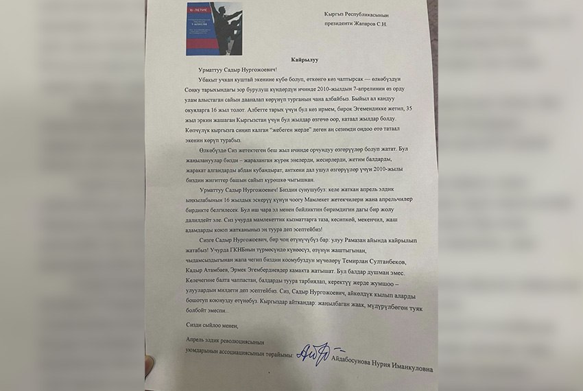 В официальном обращении на имя главы государства предлагается объединить усилия власти и участников событий 2010 года, чтобы почтить память погибших и отметить 16-ю годовщину революции. Нурия Айдабосунова подчеркнула, что совместное проведение дня памяти станет важным символом единства народа и руководства страны.