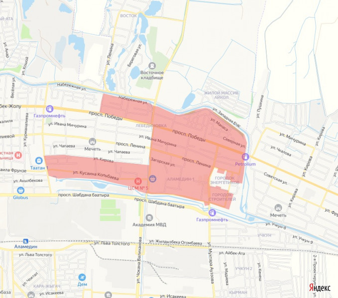 - улица Лермонтова — Ауэзова — Шабдана Баатыра — Кольбаева, канал ТЭЦ-Токмакская;