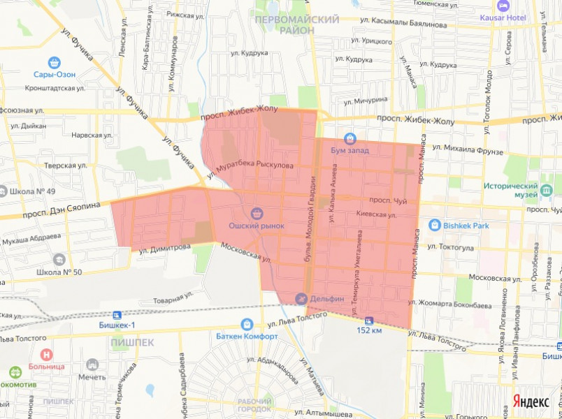 - бульвар Молодой Гвардии — линия железной дороги — улица Фрунзе — проспект Манаса;