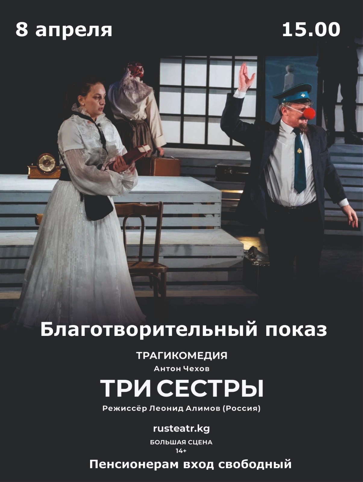 В Русском театре драмы имени Чингиза Айтматова 8 апреля в 15.00 состоится благотворительный показ спектакля «Три сестры» по пьесе Антона Чехова. Об этом сообщает заведующая литературной частью театра Алтынай Иманбекова.