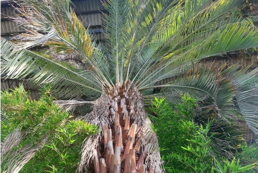 Мы заходим в пальмарий, у входа огромная пальма, бутия головчатая. Айша Турбатова говорит, что ей около 70 лет.