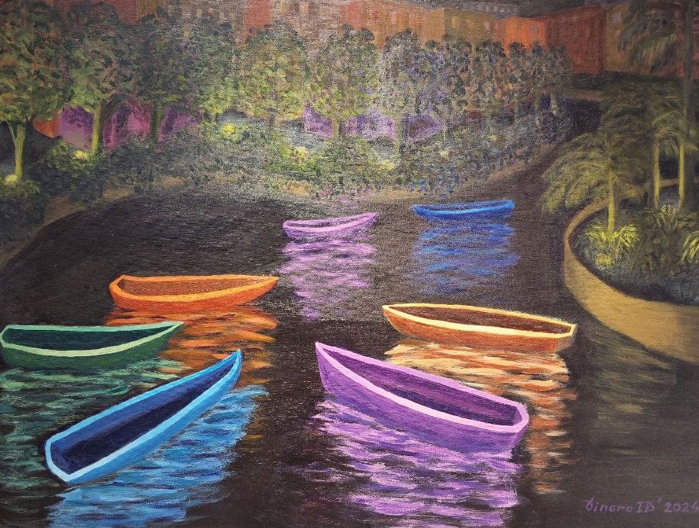 Это видно и в работах. В них много света, ярких цветов, движения. Есть и знакомые мотивы — Иссык-Куль, сцены из жизни, кыргызских песен, фильмов, путешествия в Сингапур, но все не про географию, а про состояние. Моменты, когда человек просто чувствует, что ему хорошо.