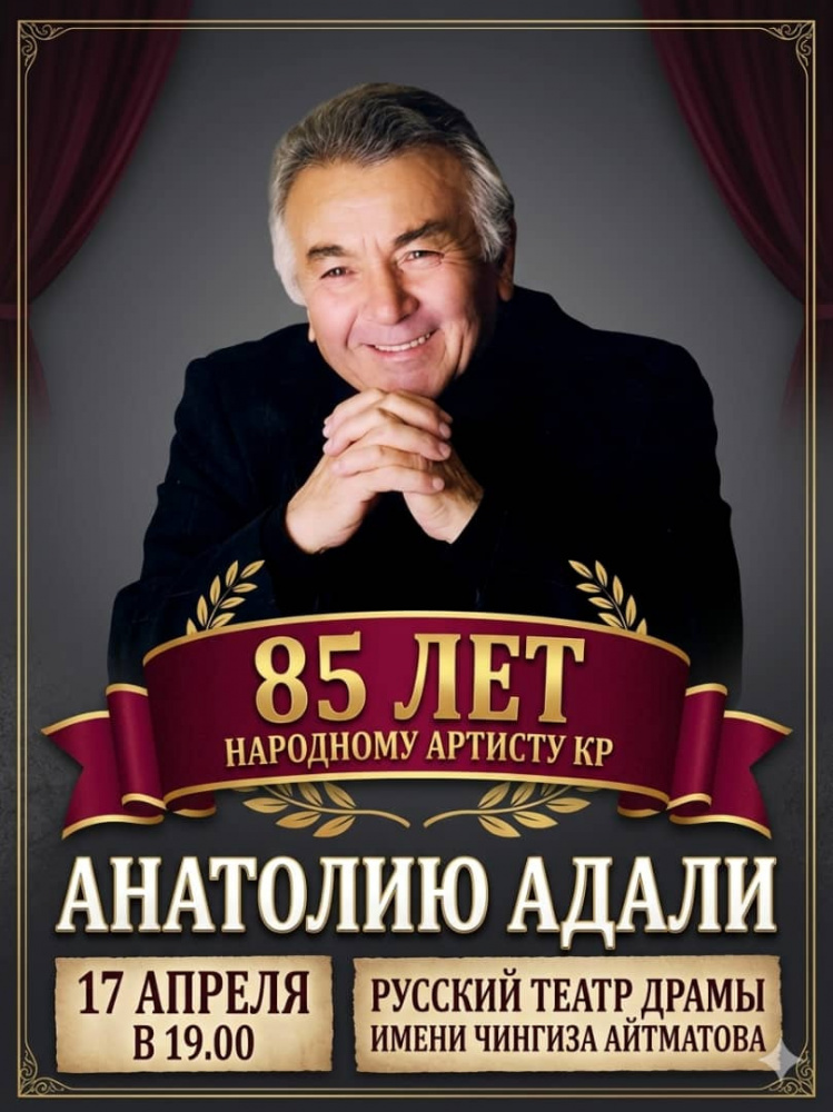 17 апреля Русский театр драмы имени Чингиза Айтматова предоставляет возможность тем, кто хочет поздравить с 85-летием народного артиста Кыргызской Республики Анатолия Адали. Об этом сообщил в соцсетях театр.
