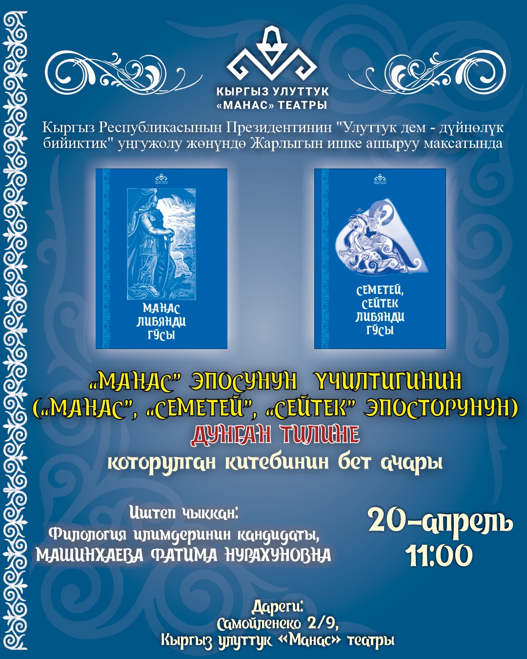 В связи с этим значимым культурным событием Кыргызский национальный театр «Манас» проведет торжественную церемонию презентации 20 апреля.