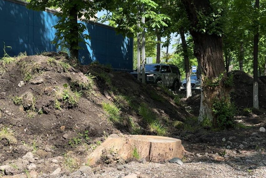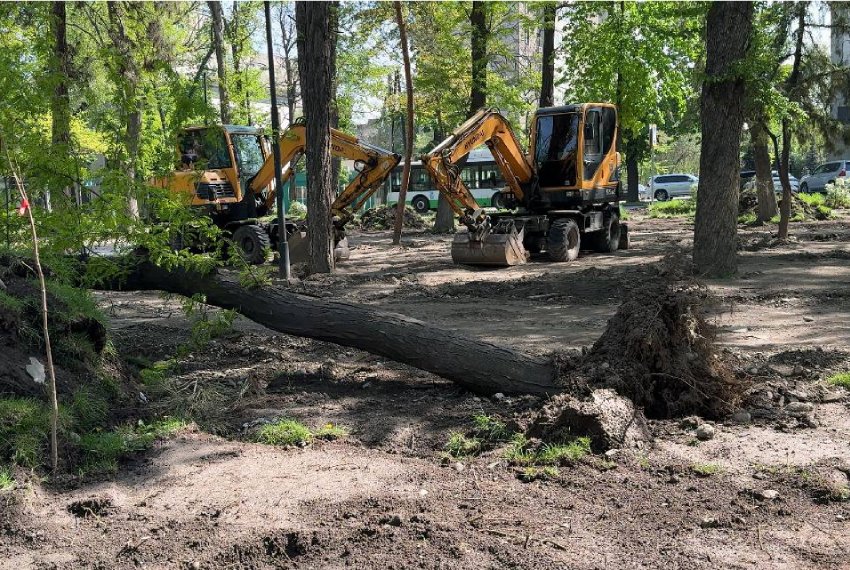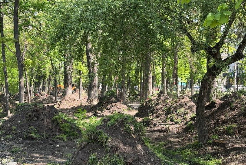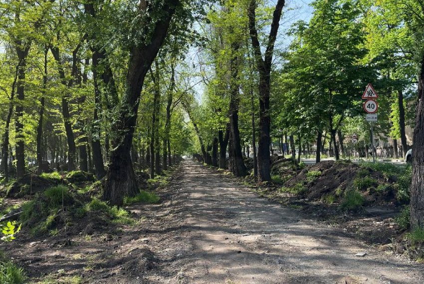 На бульваре Молодой Гвардии продолжается реконструкция на участке от улицы Боконбаева до улицы Московской. Сегодня на территории уже убраны кустарники, демонтирована брусчатка на аллеях, спилены отдельные сухие и поврежденные деревья и идет замена газона.
