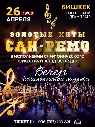 Приглашаем вас окунуться в атмосферу легендарного фестиваля «Сан-Ремо» вместе с симфоническим оркестром, солистов оперы и звезд эстрады. Вас ждут самые яркие и любимые песни и мелодии победителей фестиваля: Адриано Челентано, Тото Кутунньо, Аль Бано и Ромина Пауэр, Рикки и Повери, Андреа Бочелли, Джанни Моранди, Эрос Рамазотти и других исполнителей.